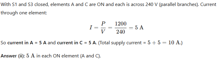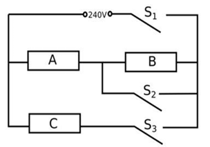 B. An electric heater consists of three similar heating elements A, B and C, connected as shown in the figure. Each heating element is rated 1.2 kW, 240 V and has constant resistance. S1, S2 and S3 are respective switches.