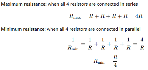 A. You are given four resistors each having resistance R ohm. Find the maximum and minimum resistance that can be made with these four resistors.