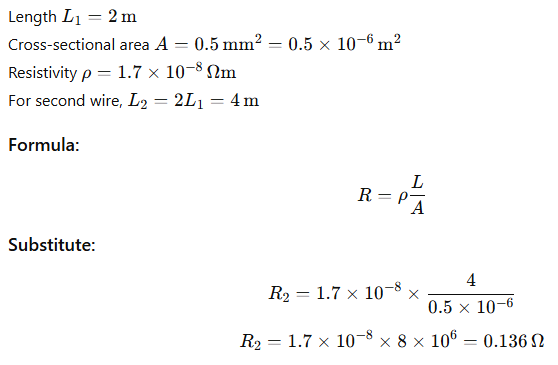 B. A copper wire has length L = 2 m, cross-sectional area A = 0.5 mm², and resistivity ρ = 1.7 × 10⁻⁸ Ωm. Calculate the resistance of another wire made of the same material whose length is twice the first but has the same cross-sectional area.