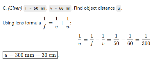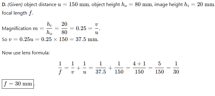 D. A photographer is using a DSLR camera to take a picture of a flower. The flower is positioned 150 mm away from the camera lens. The actual height of the flower is 80 mm, and the image height formed on the camera’s sensor is measured to be 20 mm.