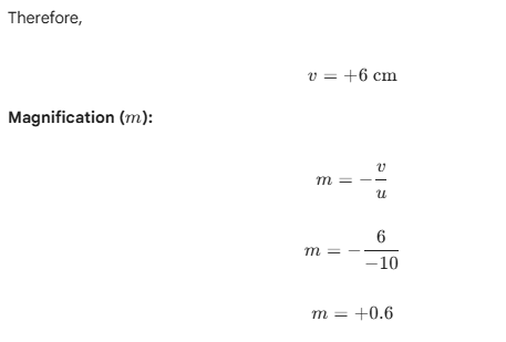 - Nature: Since $v$ is positive and magnification ($m$) is positive and less than 1, the image is virtual, erect, and diminished.