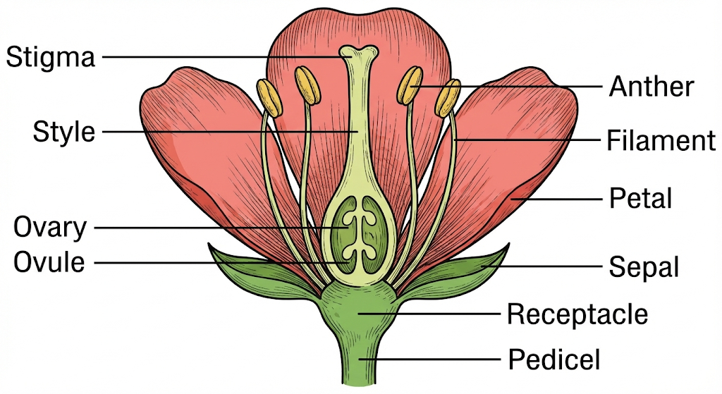 - Pistil (Female): Stigma, Style, and Ovary.