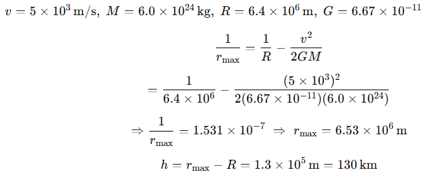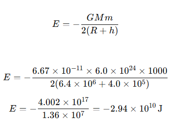7.11 Find the total mechanical energy of a satellite of mass 1000 kg orbiting at a height of 400 km above the earth’s surface. Mass of earth =6.0×1024 kg, Radius of earth =6.4×106 m.