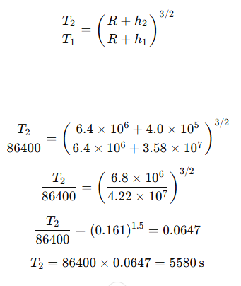 7.13 A geostationary satellite orbits the earth at a height of 35,800 km. Find the time period of a satellite orbiting at a height of 400 km.