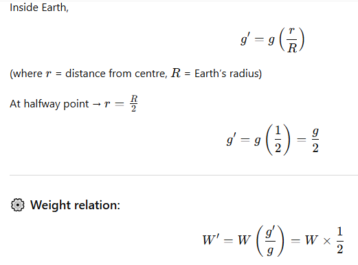 7.16 A body weighs 200 N on the surface of the earth. How much will it weigh half way down to the centre of the earth?