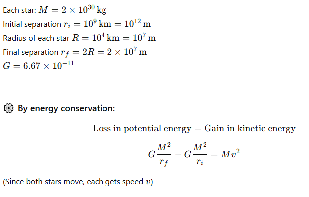 7.20 Two stars each of one solar mass (=2×1030 kg) are approaching each other for a head on collision. When they are a distance 109 km, their speeds are negligible. What is the speed with which they collide? The radius of each star is 104 km. Assume the stars to remain undistorted until they collide. (Use the known value…