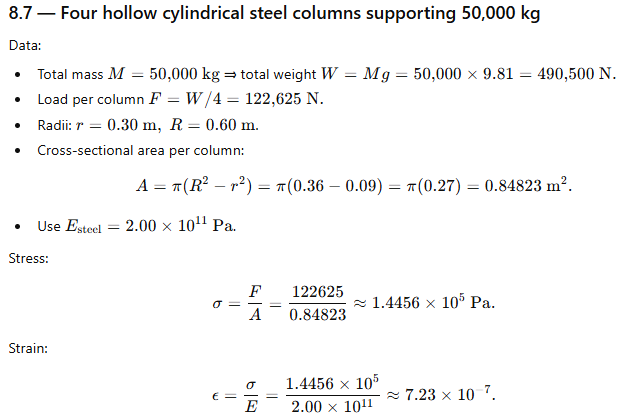 Four identical hollow steel columns (inner radius 30 cm; outer radius 60 cm) support a 50,000 kg structure.