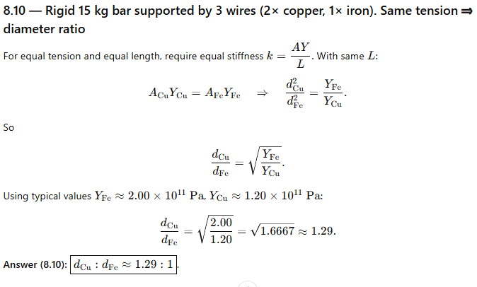 A 15 kg rigid bar is supported by three 2.0 m wires: copper at each end, iron in the middle.