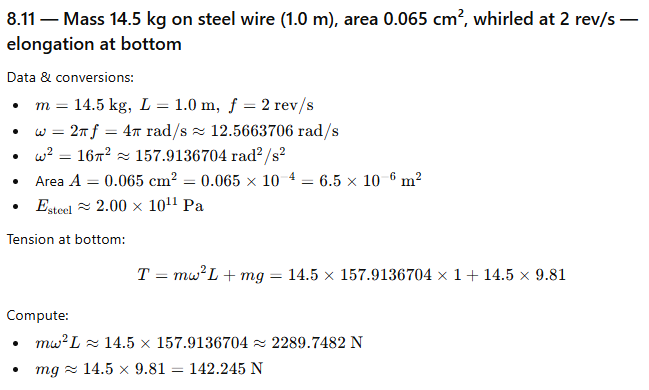 A 14.5 kg mass attached to a steel wire (1.0 m, 0.065 cm² area) is whirled at 2 rev/s in a vertical circle.