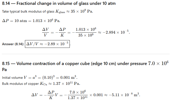 A solid copper cube (10 cm side) is subjected to a pressure of 7×10⁶ Pa.
