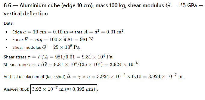 Given shear modulus = 25 GPa, find the vertical deflection of the cube face.