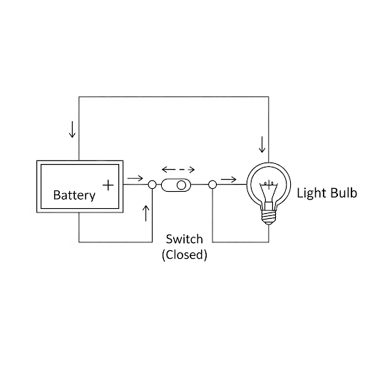 Ans : An electric circuit where current flows requires a closed loop. The diagram below shows a simple circuit with a power source (battery), a consuming device (bulb), and a switch to open and close the circuit.