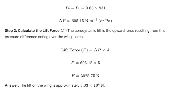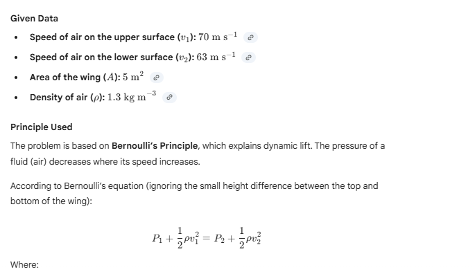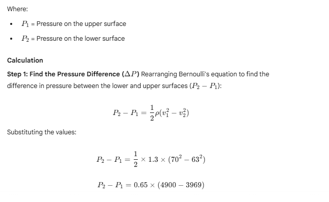 9.14 In a test experiment on a model aeroplane in a wind tunnel, the flow speeds on the upper and lower surfaces of the wing are 70 m per second and 63 m per second respectively. What is the lift on the wing if its area is 5 square metres? Density of air is 1.3 kg per cubic metre.