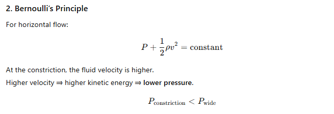 (d) For a fluid in steady flow, the increase in flow speed at a constriction follows ______. (conservation of mass / Bernoulli’s principle)