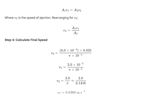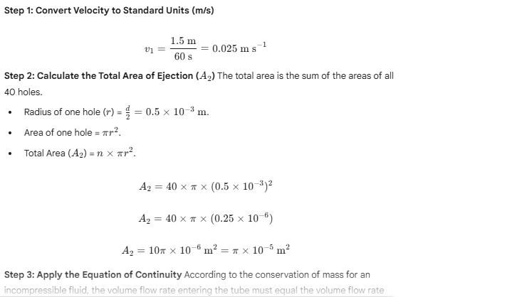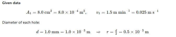 9.16 The cylindrical tube of a spray pump has a cross-section of 8.0 square centimetres. One end has 40 fine holes each of diameter 1.0 millimetre. If the liquid flow inside the tube is 1.5 m per minute, what is the speed of ejection of the liquid through the holes?