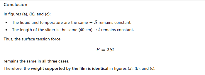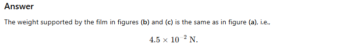 9.18 A thin liquid film supports a weight of 4.5 × 10 to the power minus 2 newton in figure 9.21(a). What weight will be supported by a film of the same liquid at the same temperature in figures 9.21(b) and 9.21(c)? Explain physically.