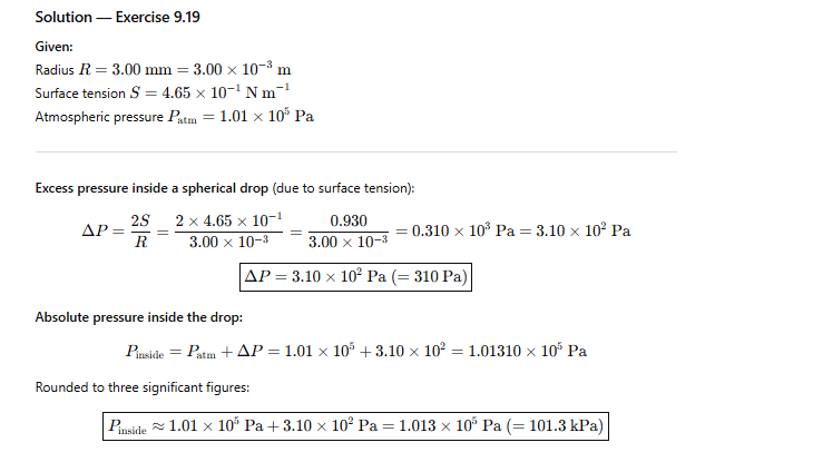 9.19 What is the pressure inside a drop of mercury of radius 3.00 mm at room temperature? Surface tension of mercury at 20 degrees Celsius is 4.65 × 10 to the power minus 1 newton per metre. Atmospheric pressure is 1.01 × 10 to the power 5 pascal. Also state the excess pressure inside the drop.
