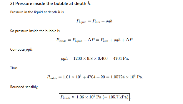 9.20 What is the excess pressure inside a bubble of soap solution of radius 5.00 mm, given that the surface tension is 2.50 × 10 to the power minus 2 newton per metre? If an air bubble of the same radius is formed at a depth of 40.0 cm inside a container of soap solution of relative density 1.20, what would be the pressure inside the bubble? One atmospheric pressure equals 1.01 × 10 to the power 5 pascal.