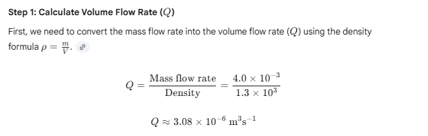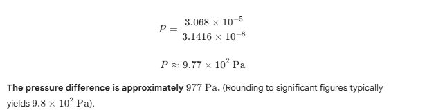 9.13 Glycerine flows steadily through a horizontal tube of length 1.5 m and radius 1.0 cm. If the amount of glycerine collected per second at one end is 4.0 × 10 to the power minus 3 kg per second, what is the pressure difference between the two ends of the tube? Density of glycerine is 1.3 × 10 to the power 3 kg per cubic metre, and viscosity is 0.83 pascal second. You may also check if the assumption of laminar flow is correct.